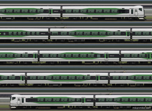 2025年9月6日(土)に運転された大宮総合車両センター所属のE257系5000番台 OM-92編成の長編成サイドビューです。(特急あずさ71号関係の松本→長野への回送)